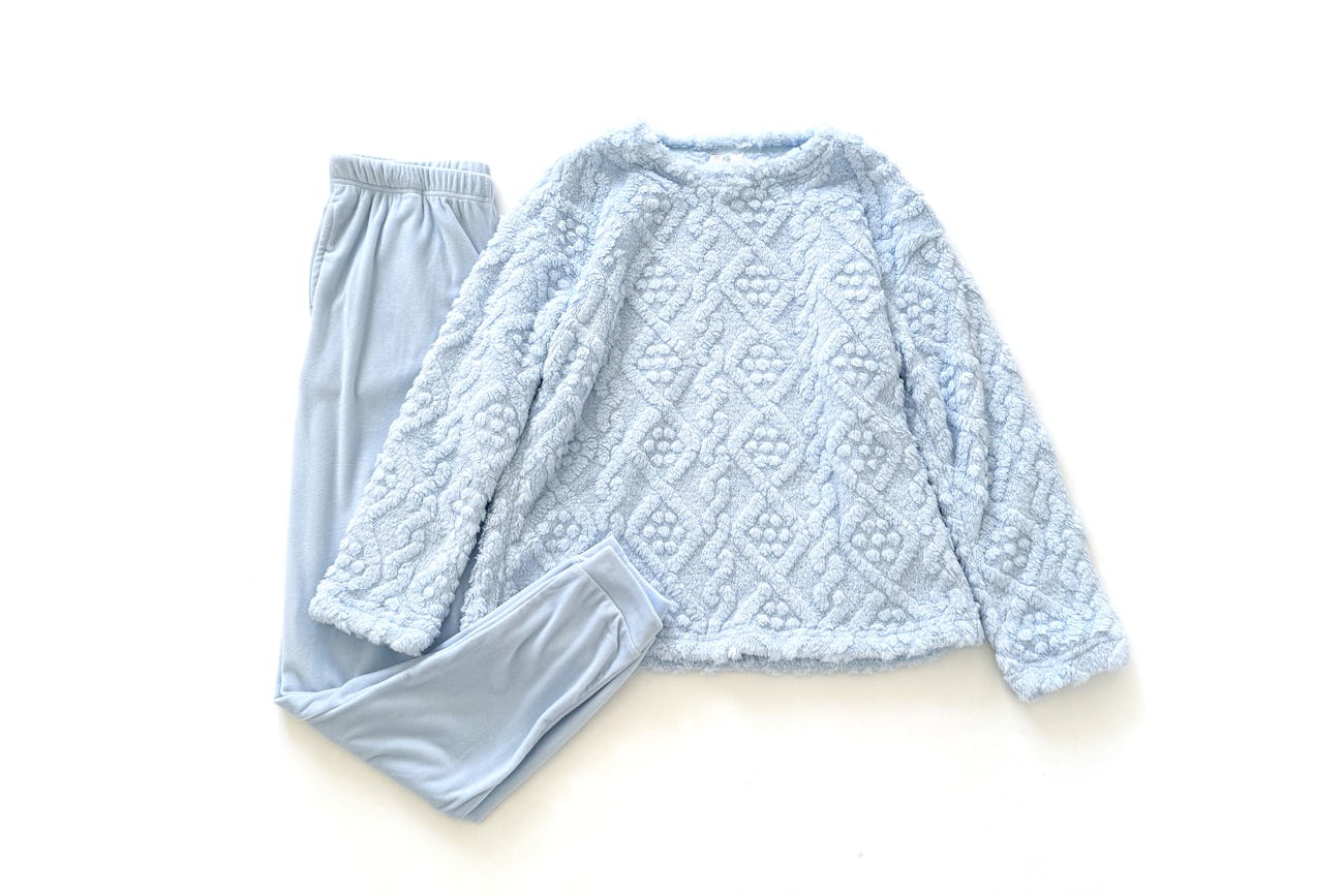 True to size. Plush and posh, this two-piece set has you feeling put-together for your downtime look. Standout touches like embroidery or jacquard add a quiet glam aesthetic to your sleepwear and the super soft polyester plush wraps you in warmth for snow days in or anytime you’re team comfort.
