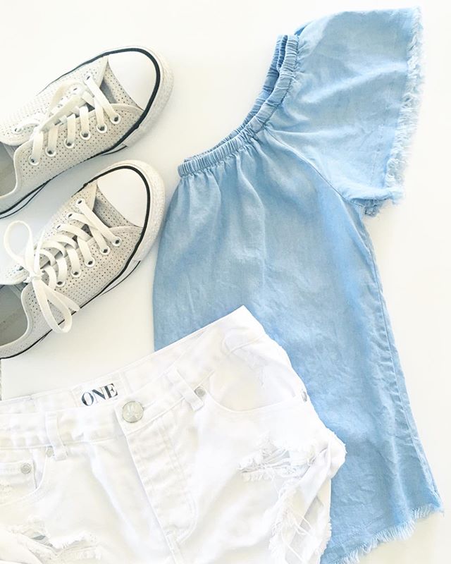 This outfit will be on repeat this summer! ? This chambray off-the-shoulder top is found in-store and online for only $10.88! Shop this look below!
