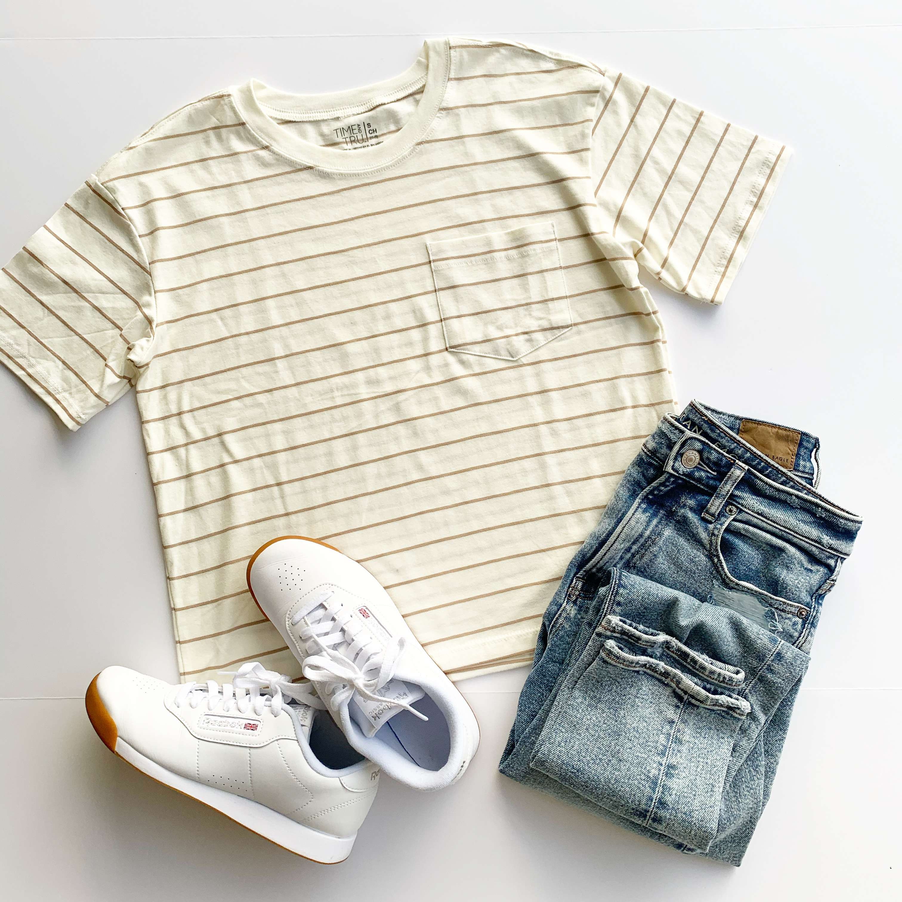 Time and Tru Boyfriend Tee, American Eagle Mom Jean, and Reebok Sneakers