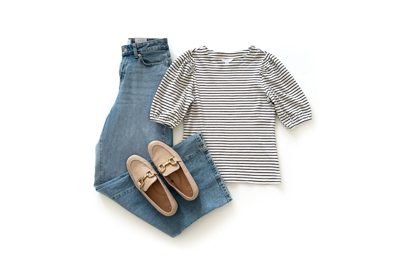 Proof that simple pieces styled well just work. A puff sleeve stripe tee, light wash wide leg jeans, and natural loafers with gold accents — such a chic Walmart outfit idea. Get a closer look at it in my Reel and shop the whole look below.