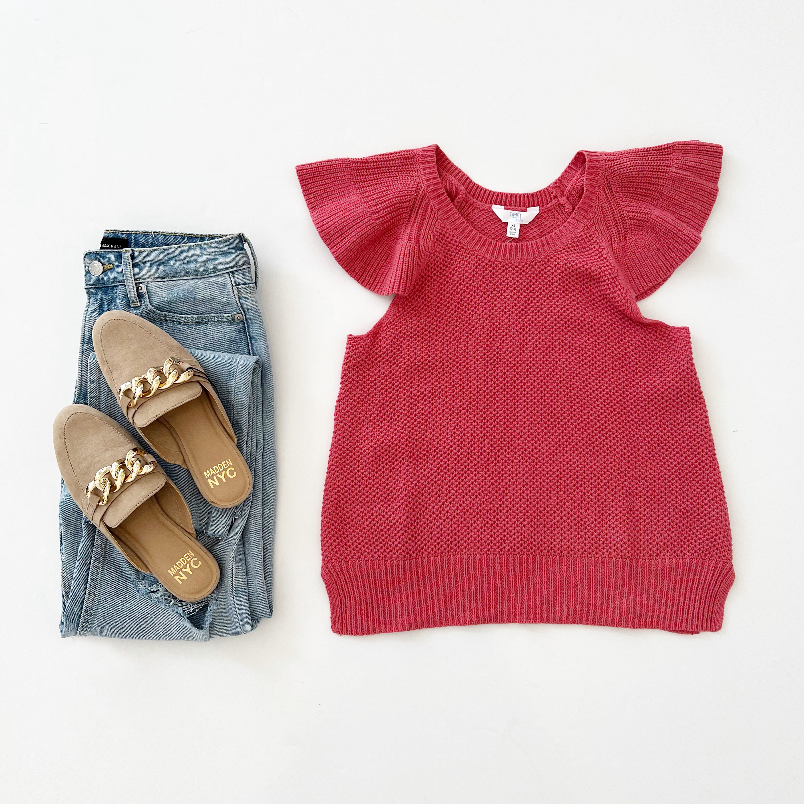 Time and Tru Flutter Sleeve Sweater Tank, Free Assembly High Rise Straight Jeans and Madden NYC Chain Mule