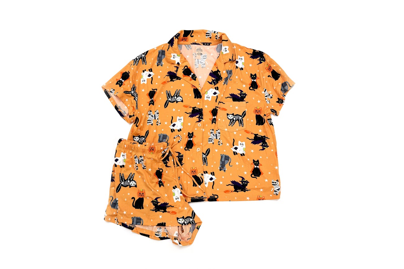True to size. This pajama set brings just the right dose of Halloween spirit. Featuring a button-front top with a notched collar and matching shorts (complete with handy pockets), this womenโs set helps keep you lounge-ready this spooky season.